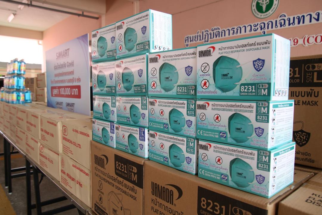 กนกวรรณ จันทร์สว่างภูวนะ (ที่ 2 จากขวา) ผู้อำนวยการฝ่ายสื่อสารองค์กร บมจ.สามารถคอร์ปอเรชั่น และนิศาชล อุดมวงศ์วิวัฒน์ ผู้อำนวยการฝ่ายทรัพยากรบุคคลและจัดซื้อ บมจ.สามารถเทลคอม มอบอุปกรณ์ทางการแพทย์ ได้แก่ หน้ากากอนามัยทางการแพทย์ (แบบ 3D) จำนวน 2,600 ชิ้น และแอลกอฮอล์ 70% จำนวน 1,000 ขวด เพื่อช่วยเพิ่มศักยภาพและความคล่องตัวในด้านการรองรับผู้ป่วย COVID-19 ให้กับโรงพยาบาลสนามในเขตจ.นนทบุรี โดยมี สิรภัทร พงศ์ปิยะไพบูลย์ (ที่ 2 จากซ้าย) รองนายแพทย์สาธารณสุขจังหวัดนนทบุรี เป็นตัวแทนในการรับมอบของบริจาค ณ สำนักงานสาธารณสุขจังหวัดนนทบุรี เมื่อเร็วๆนี้