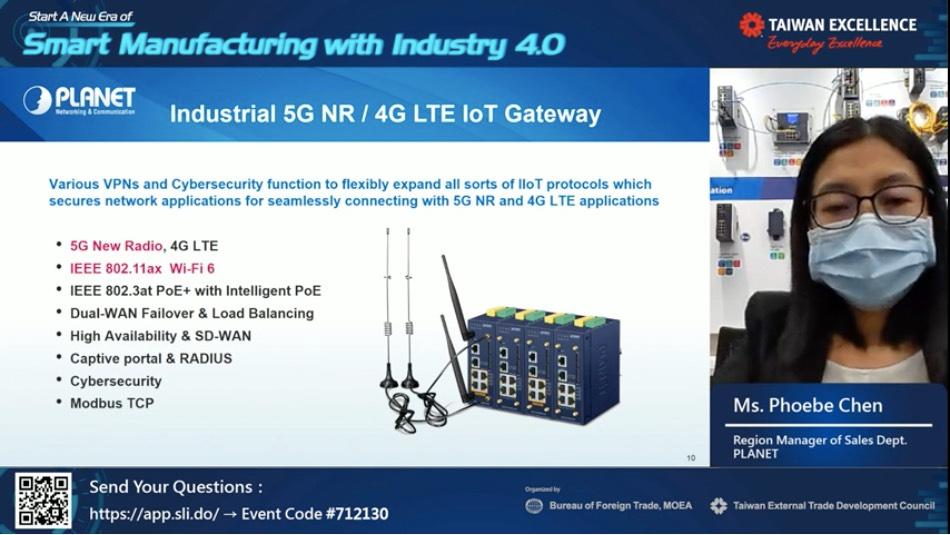 ด้าน คุณฟรานซีน ชู รองผู้จัดการฝ่ายโปรแกรม บริษัท เทคแมน โรบอท ได้นำเสนอวิธีการใช้หุ่นยนต์ TM12 และซอฟต์แวร์พิเศษเพื่อสร้างโซลูชันอัจฉริยะสำหรับคลังสินค้า และช่วยให้เกิดประสิทธิภาพและความปลอดภัย คุณเอพริล ลิน ตัวแทนฝ่ายขาย บริษัท เอออน เทคโนโลยี ได้แสดงถึงการนำระบบปัญญาประดิษฐ์ (AI) + การตรวจสอบด้วยแสงอัตโนมัติ (AOI) ไปใช้ในสถานีงานประกันคุณภาพของสายการผลิต ซึ่งไม่เพียงแต่ลดกำลังคนในการตรวจสอบผลิตภัณฑ์เท่านั้น แต่ยังช่วยปรับปรุงประสิทธิภาพการผลิตและเพิ่มผลผลิตได้อีกด้วย สุดท้าย คุณฟีบี้ เฉิน ผู้จัดการฝ่ายภูมิภาค บริษัท แพลนเน็ต เทคโนโลยี คอร์ปอเรชั่น ได้เปิดตัวเกตเวย์ IoT บนเครือข่าย 5G สำหรับโรงงานอุตสาหกรรม ซึ่งช่วยให้ผู้ผลิตสามารถสร้างโรงงาน 5G ขั้นสูง และ “ระบบควบคุมการจัดการพลังงานทดแทน” ซึ่งช่วยให้โรงงานอัจฉริยะสามารถปรับปรุงประสิทธิภาพการใช้พลังงานได้