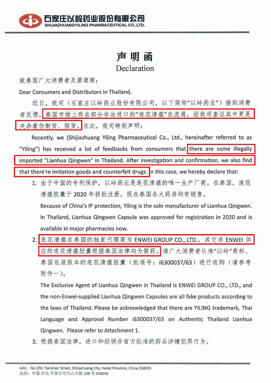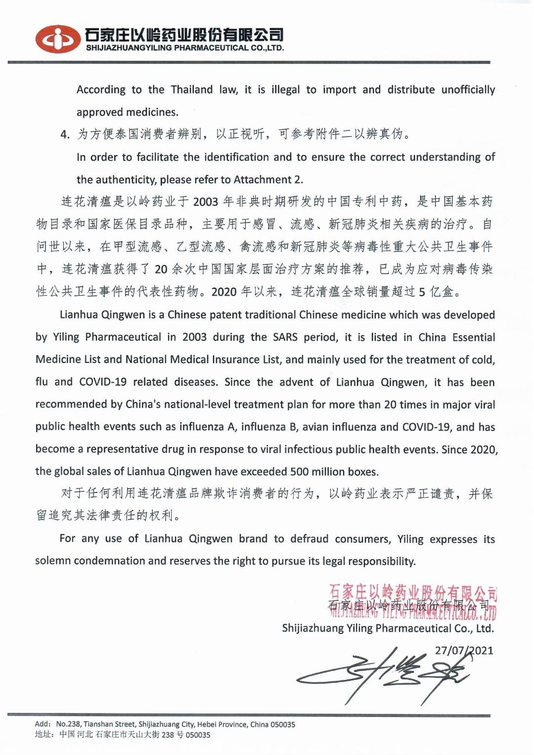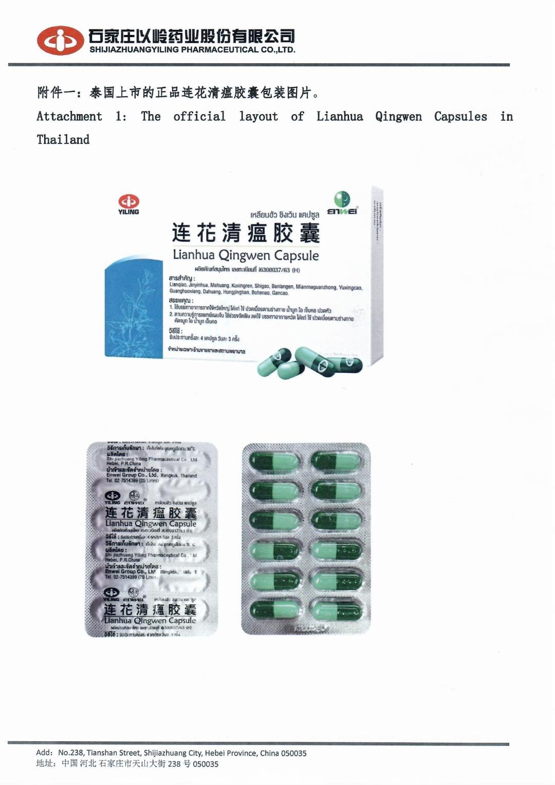ทั้งนี้ บริษัท เอินเวย์ กรุ๊ป จำกัด เป็นผู้นำเข้าและจัดจำหน่ายยา เหลียนฮัว ชิงเวิน แคปซูล ในประเทศไทยอย่างเป็นทางการแต่เพียงผุ้เดียว โดยมีจำหน่ายเฉพาะในร้านขายยาและสถานพยาบาลเท่านั้น กฎหมายไม่อนุญาตให้ขายผลิตภัณฑ์สมุนไพรผ่านทางสื่อออนไลน์และห้ามโฆษณาผลิตภัณฑ์โดยไม่ได้รับอนุญาต ซึ่งหากผู้บริโภคสั่งซื้อผลิตภัณฑ์ดังกล่าวที่มีการลักลอบขายทางสื่อออนไลน์ เสี่ยงต่อการได้รับผลิตภัณฑ์สมุนไพร ปลอมและไม่ได้คุณภาพ และอาจได้รับอันตรายถึงแก่ชีวิตได้