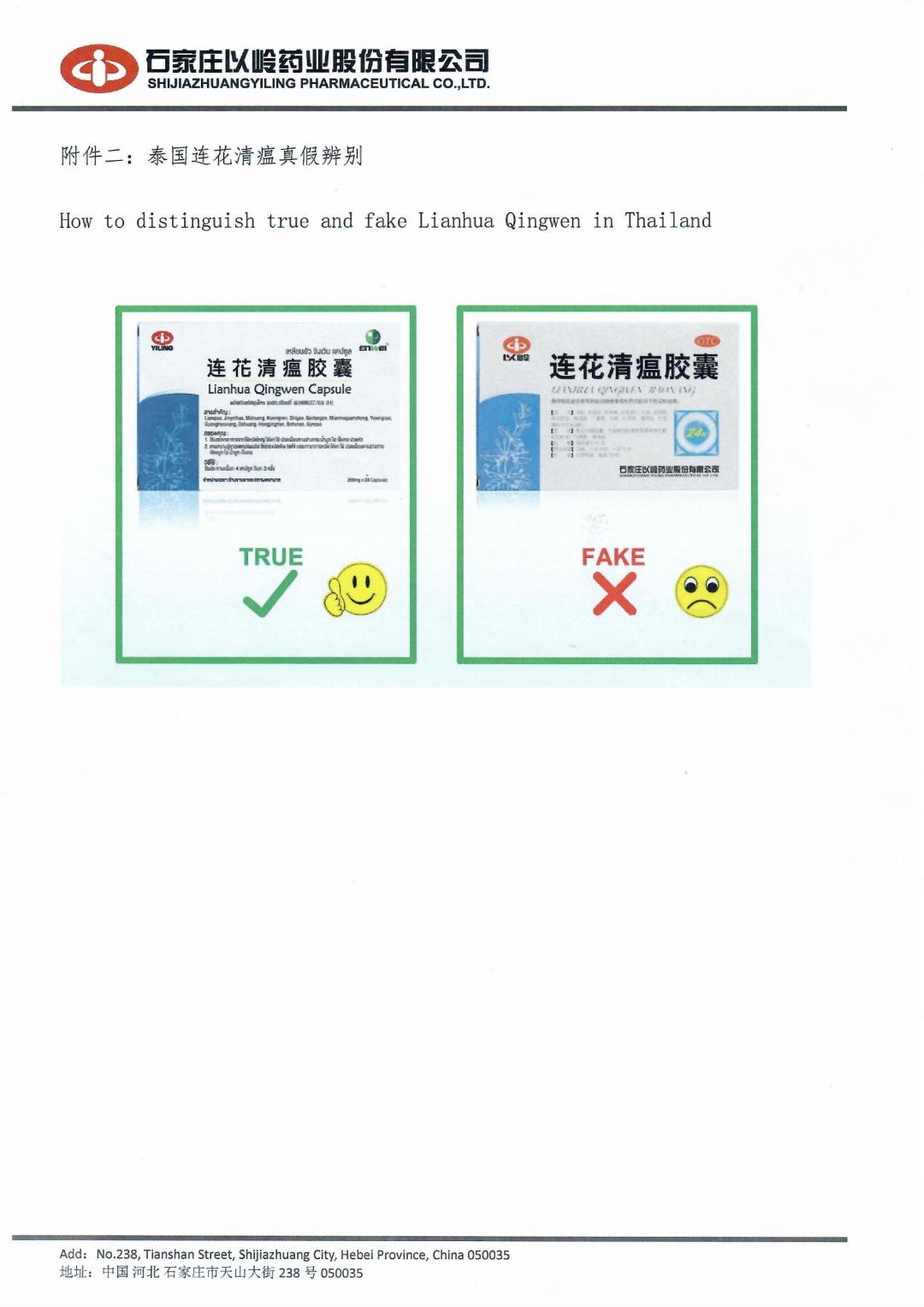 "เนื่องจากปัจจุบันสถานการณ์การแพร่ระบาดของโควิด-19 ในประเทศไทยทวีความรุนแรงมากขึ้นทุกวัน ทำให้ความต้องการของยา ยาเหลียนฮัว ชิงเวิน แคปซูล เพิ่มขึ้นอย่างรวดเร็ว จึงพบผู้ฉวยโอกาสท้าทายกฎหมาย นำสินค้าปลอมและลอกเลียนแบบ ออกมาจำหน่ายตามช่องทางออนไลน์ และร้านค้าเป็นจำนวนมาก เอินเวย์ และ ยี่หลิง(Yiling) บริษัทผู้ผลิต เหลียนฮัว ชิงเวิน แคปซูล หวั่นเกรงผู้บริโภคจะได้รับอันตรายและเสียโอกาสในการรักษาจากการใช้ยาปลอม ซึ่งจะยิ่งซ้ำเติมความเจ็บปวดและความเลวร้ายของสถานการณ์
