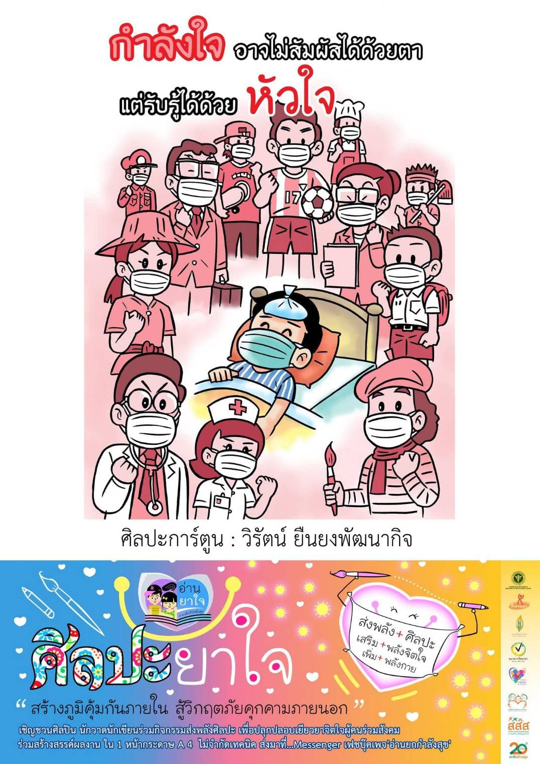 สำนักงานกองทุนสนับสนุนการสร้างเสริมสุขภาพ (สสส.) ร่วมกับ แผนงานสร้างเสริมวัฒนธรรมการอ่าน ,สมาคมนักเขียนแห่งประเทศไทย , ธนาคารจิตอาสา , พลังวรรณกรรมเพื่อสร้างพลังชีวิต จัดโครงการ “ศิลปะยาใจ ฝ่าภัยโควิด-19" หวังใช้งานศิลปะเป็นสิ่งปลอบประโลมใจให้แก่ประชาชนที่กำลังท้อแท้สิ้นหวังในภาวะวิกฤติ “โควิด-19” โดยเชิญชวนศิลปิน นักวาด นักการ์ตูน ช่างภาพ หรือประชาชนคนทั่วไป ทุกเพศ ทุกวัย ร่วมส่งผลงานเพื่อปลุกพลังใจให้แก่เพื่อนร่วมสังคม