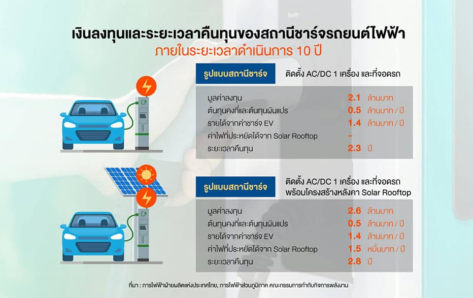 จากผลการศึกษาของการไฟฟ้าฝ่ายผลิตระบุว่า สถานีชาร์จรถยนต์ไฟฟ้าแต่ละประเภทใช้เงินลงทุนเฉลี่ยประมาณ 2-3 ล้านบาท ต่อการติดตั้ง AC 1 เครื่อง หรือ DC 1 เครื่อง พร้อมที่จอดรถ โดยมีระยะเวลาคืนทุนประมาณ 2-4 ปี