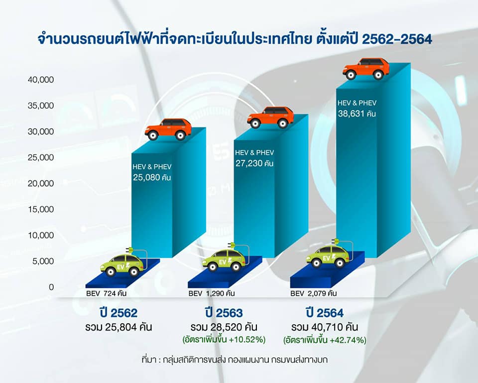 จากรายงานของกรมการขนส่งทางบก ระบุว่า นับตั้งแต่ปี 2562-2564 มีจำนวนรถยนต์ไฟฟ้าทั้งแบบ HEV (Hybrid Electric Vehicle), BEV (Battery Electric Vehicle), และ PHEV (Plug-in Hybrid Electric Vehicle) จดทะเบียนในประเทศรวมทั้งสิ้น 95,034 คัน เฉพาะปี 2564 มีจำนวนยอดจดทะเบียนรถไฟฟ้าทั้ง HEV, BEV, PHEV ทั้งสิ้น 40,710 คัน เติบโต 43% จากปี 2563 ในขณะตัวเลขยอดจองรถยนต์นั่งไฟฟ้า หรือ xEV ในงานมอเตอร์โชว์ 23 มีนาคม– 3 เมษายนที่ผ่านมา มียอดจอง 3,100 คัน หรือคิดเป็น 10% ของยอดจองรถยนต์ทั้งหมดในงาน