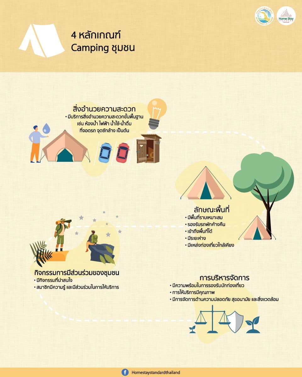 4. Camping ชุมชน หมายถึง ชุมชนที่ได้มาตรฐานที่มีการจัดสรรพื้นที่ ลานกางเต้นท์ในชุมชนให้นักท่องเที่ยวได้อย่างมีคุณภาพ ตามหลักเกณฑ์ที่กรมการท่องเที่ยวกำหนด รองรับนักท่องเที่ยวสายแคมป์ปิ้งได้อย่างเหมาะสมน่าประทับใจ จำนวน 6 ชุมชน