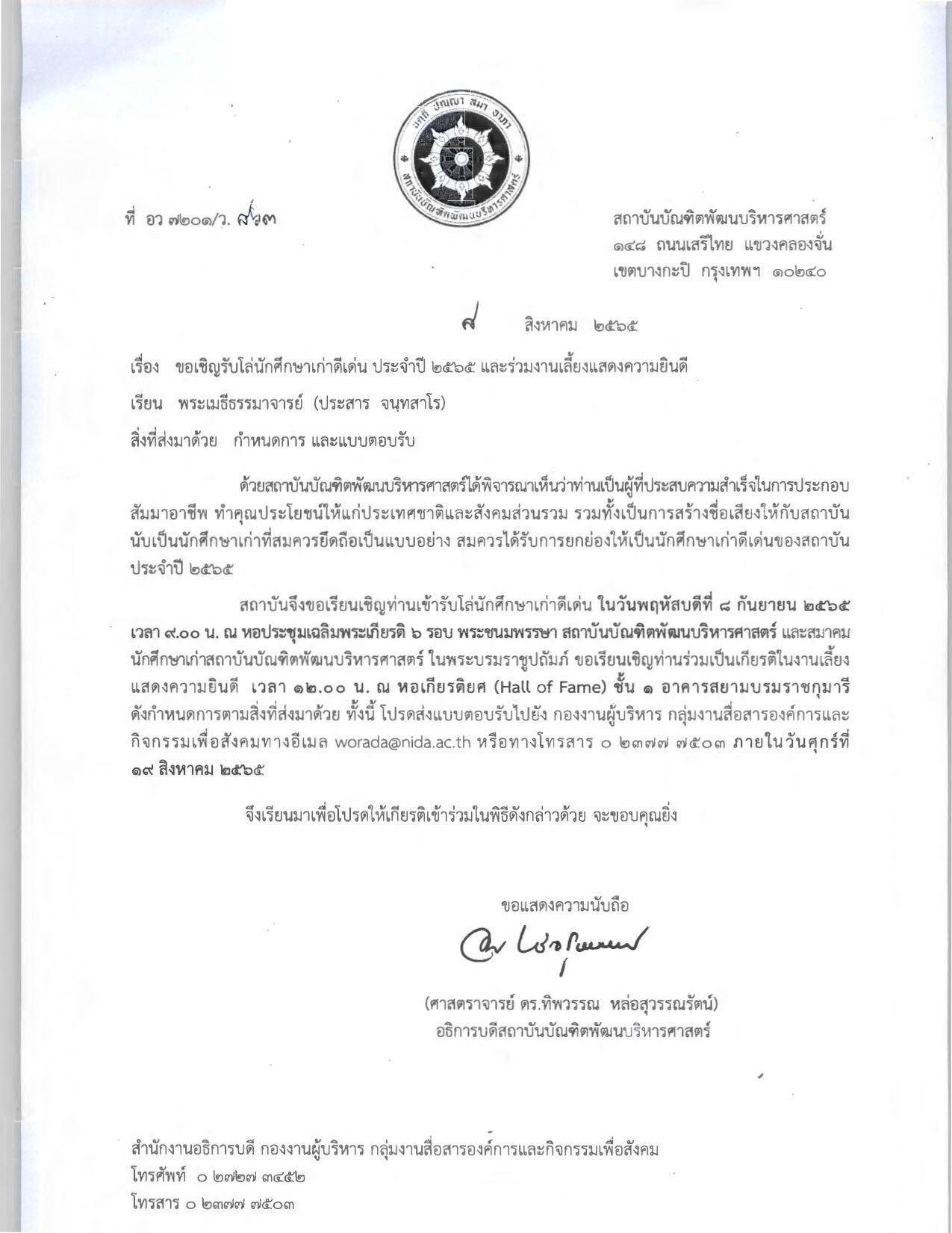 ศาสตราจารย์ ดร.ทิพวรรณ หล่อสุวรรณรัตน์ อธิการบดีสถาบันบัณฑิตพัฒนบริหารศาสตร์ (นิด้า) ส่งหนังสือนิมนต์ พระเมธีธรรมาจารย์ (เจ้าคุณประสาร) รักษาการรองอธิการบดีฝ่ายวางแผนและพัฒนา มหาวิทยาลัยมหาจุฬาลงกรณราชวิทยาลัย (มจร)ในฐานะศิษย์เก่า รับโล่นักศึกษาดีเด่นประจำปี 2565 โดยมีรายละเอียดดังนี้