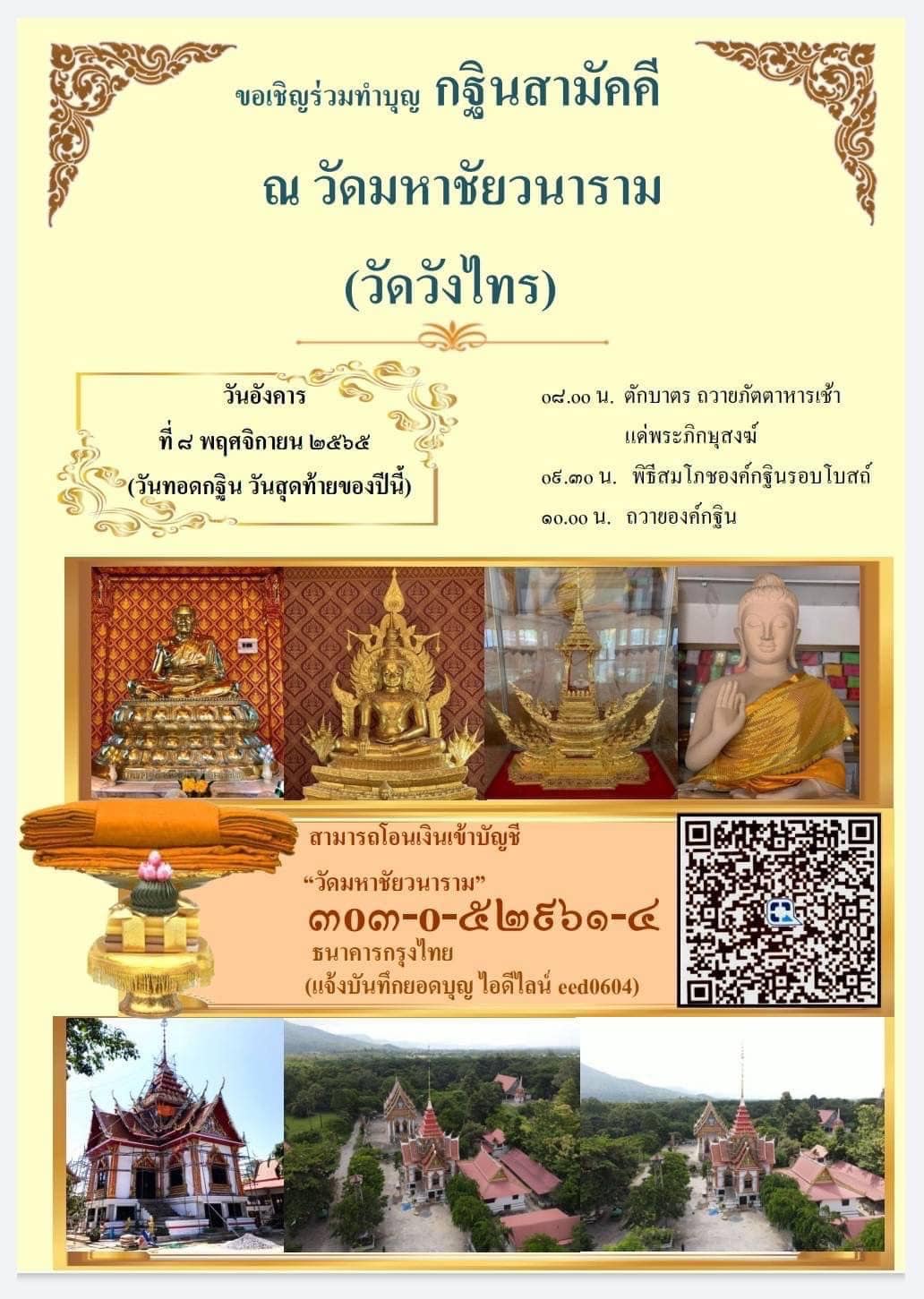วัดมหาชัยวนาราม (วัดวังไทร) อ.ปากช่อง เตรียมจัดงานทำบุญทอดกฐินสามัคคี ในวันที่ 8 พฤศจิกายน 2565 เชิญผู้มีจิตรศรัทธาร่วมทำบุญสร้างมณฑป สมเด็จองค์ปฐม และบูรณะปฏิสังขรณ์ ศาสนสถานและกิจการต่างๆ